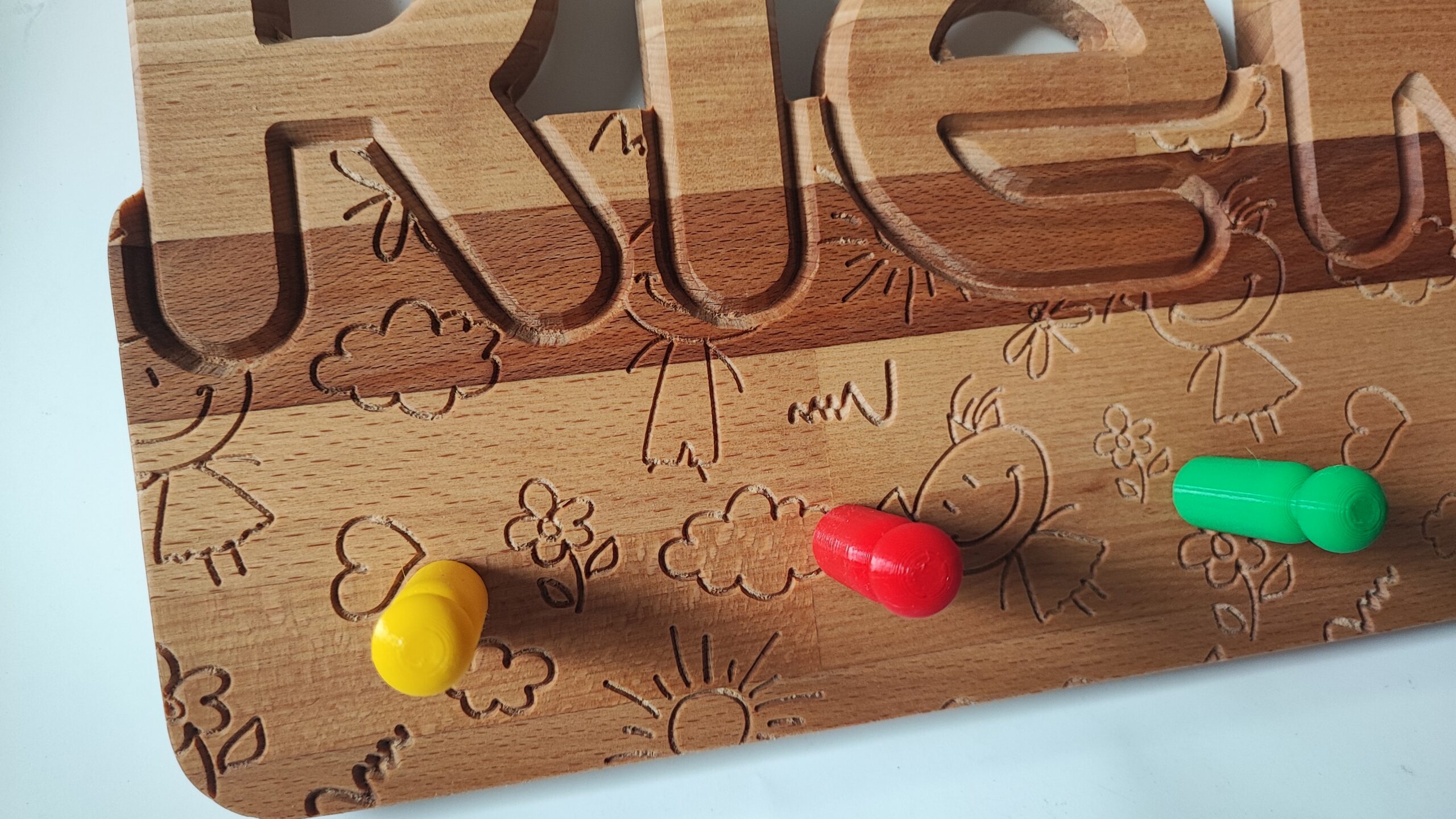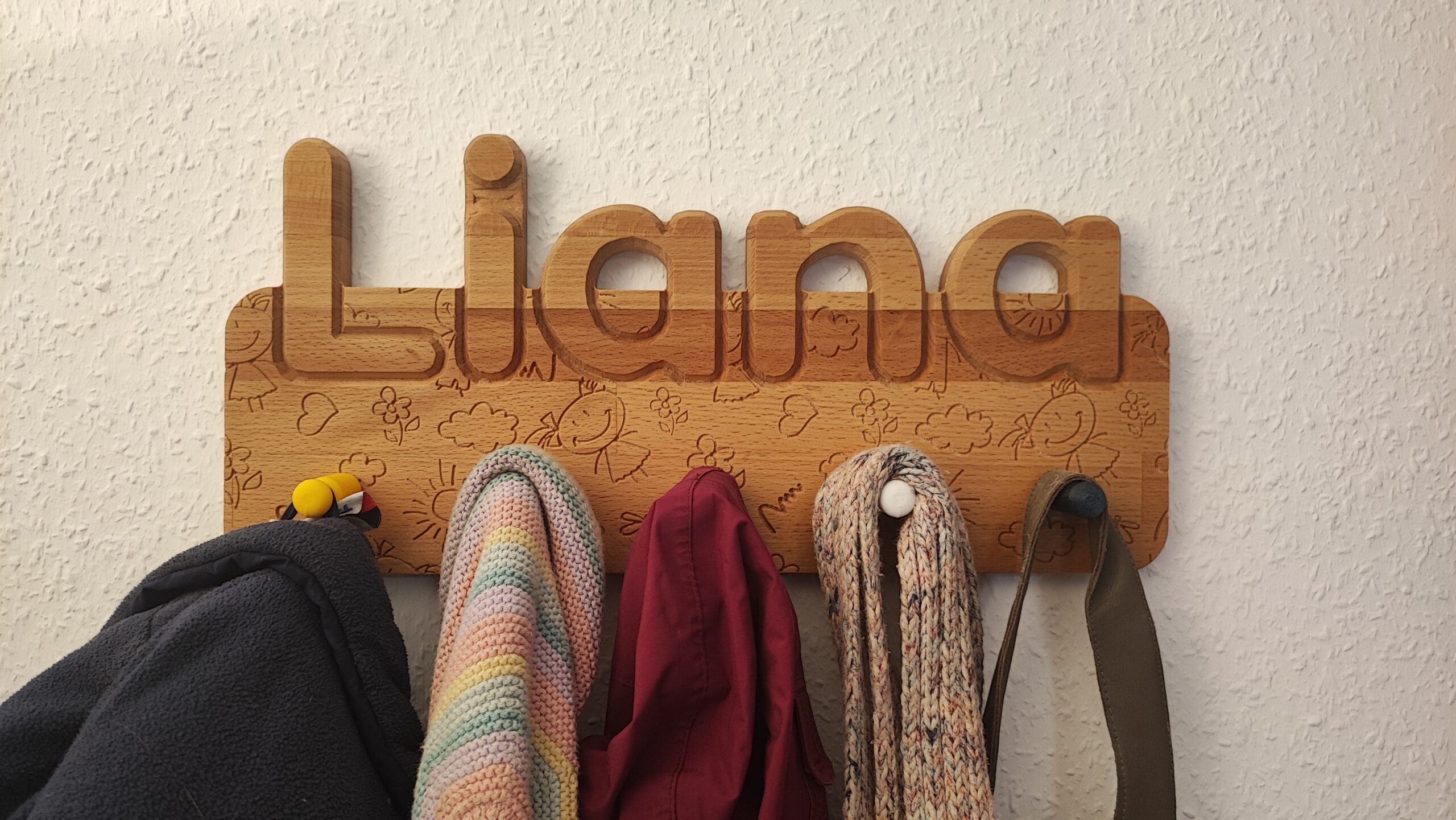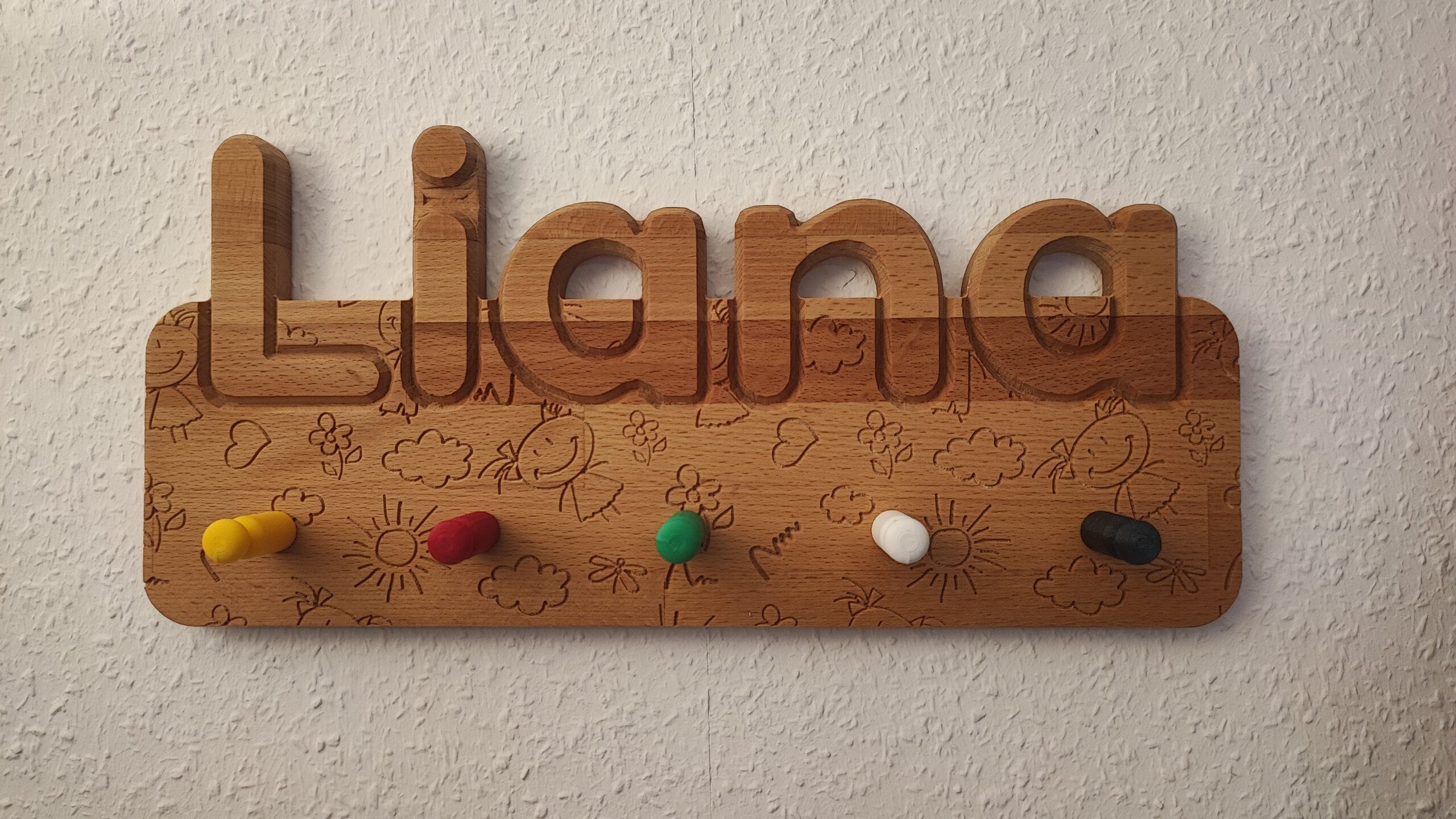 Diese Kindergarderobe ist ein Blickfang in jedem Flur oder Kinderzimmer. Sie ist aus einem Stück Buche Leimholz gefertigt (also keine aufgeklebten Buchstaben!) mit 3D gedruckten Haltern sowie Aufhängern auf der Rückseite. Auf der Vorderseite sind kleine Figuren, Herzen und Libellen eingraviert.