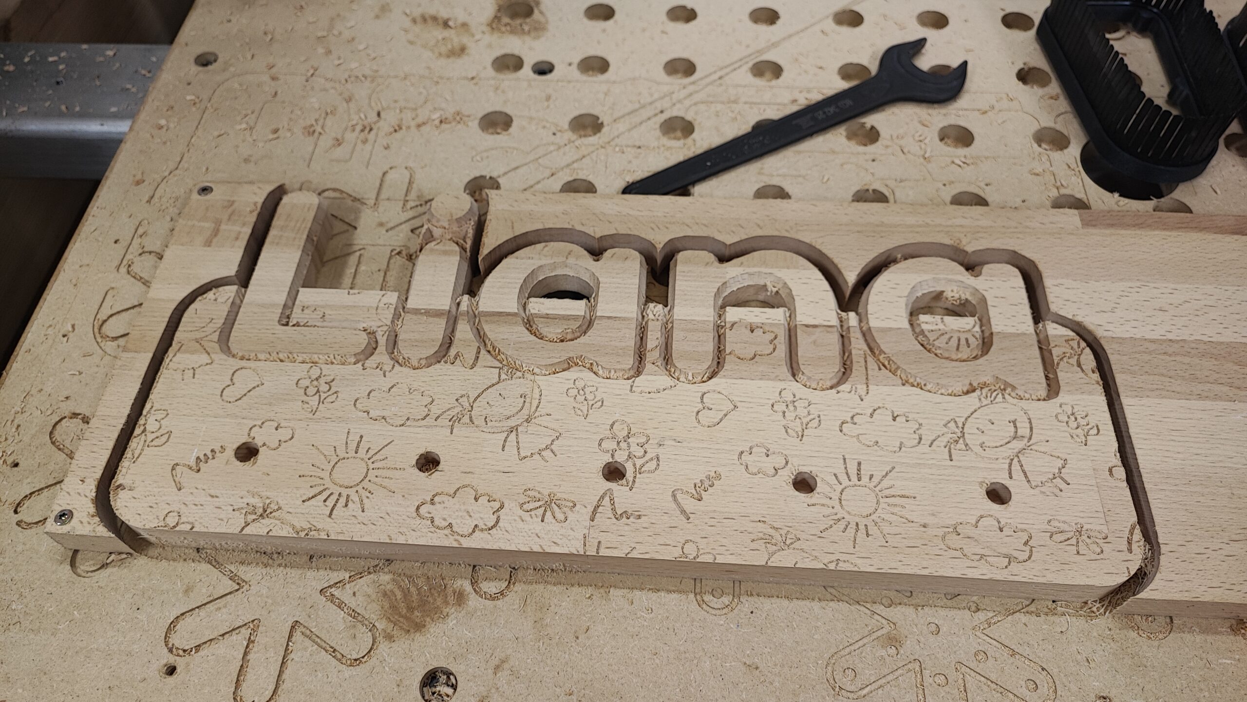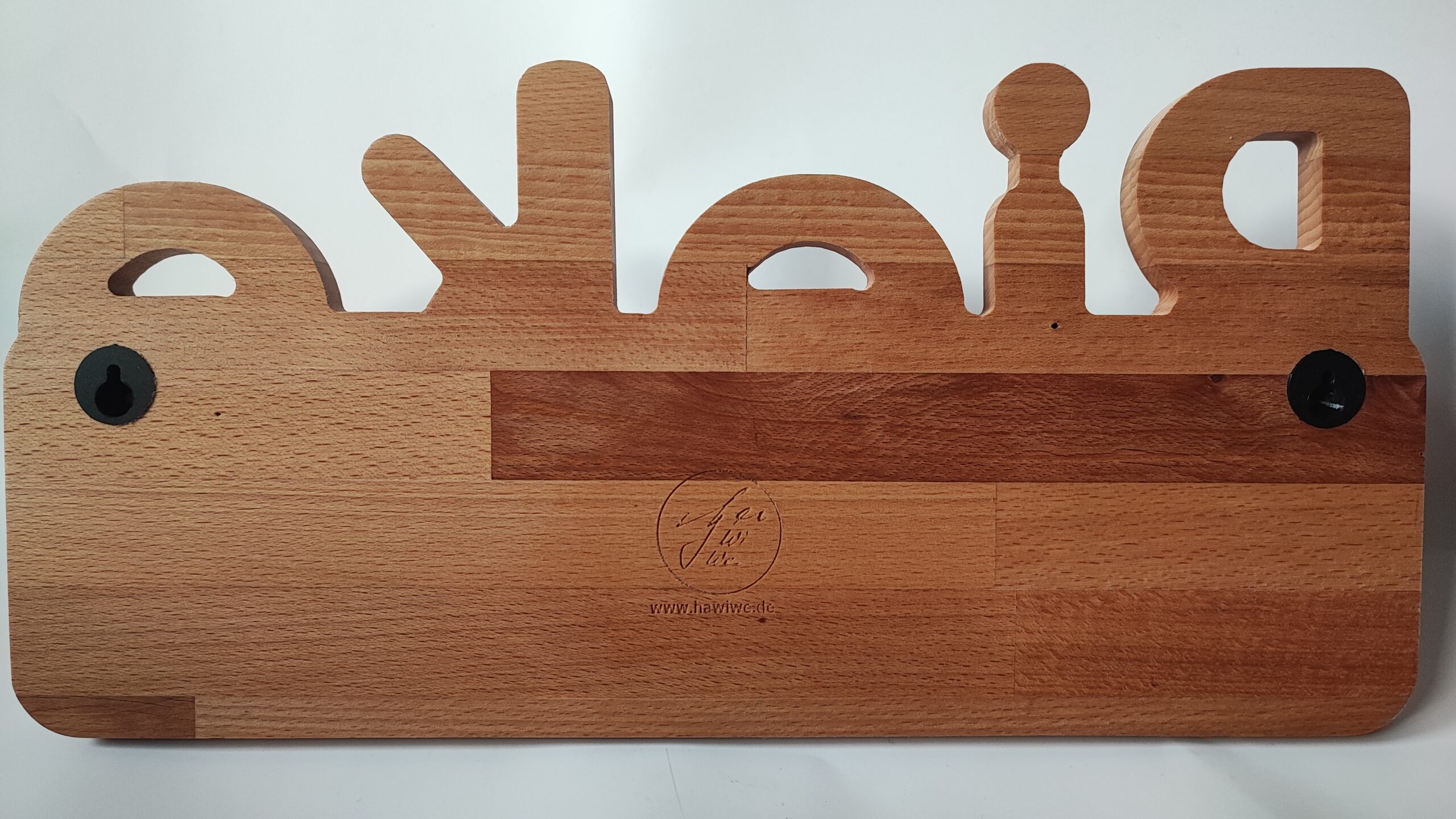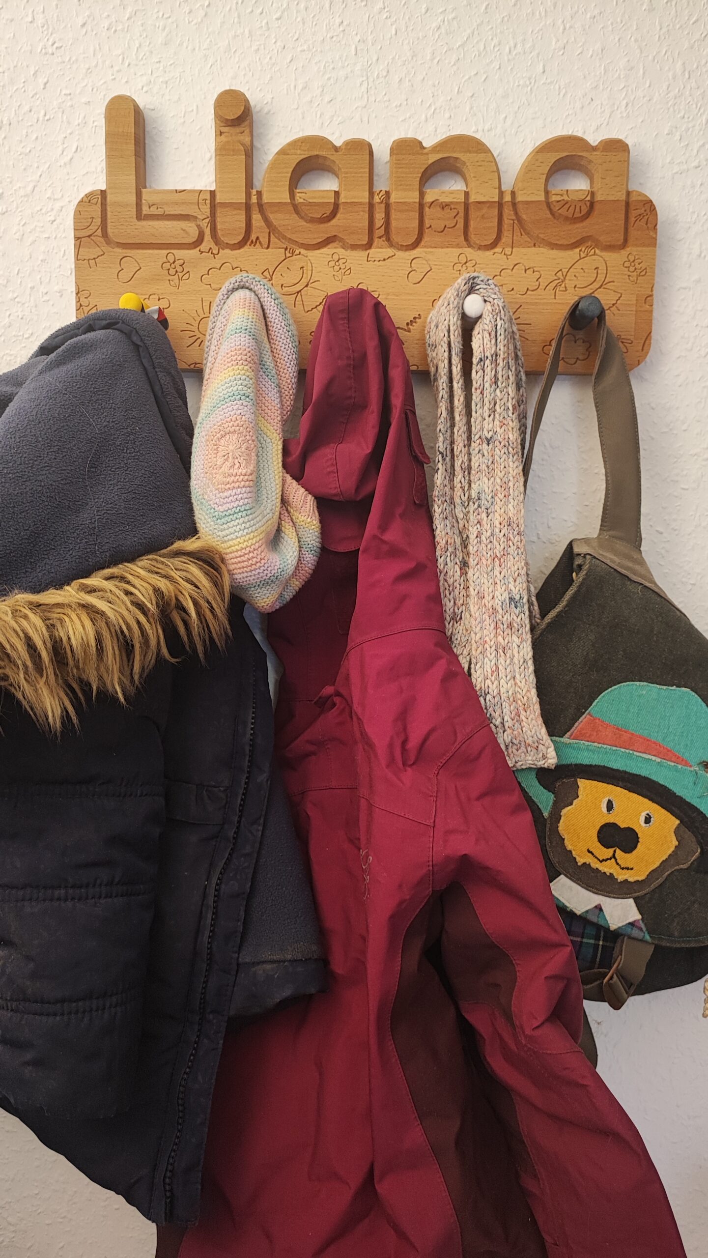 Diese Kindergarderobe ist ein Blickfang in jedem Flur oder Kinderzimmer. Sie ist aus einem Stück Buche Leimholz gefertigt (also keine aufgeklebten Buchstaben!) mit 3D gedruckten Haltern sowie Aufhängern auf der Rückseite. Auf der Vorderseite sind kleine Figuren, Herzen und Libellen eingraviert.